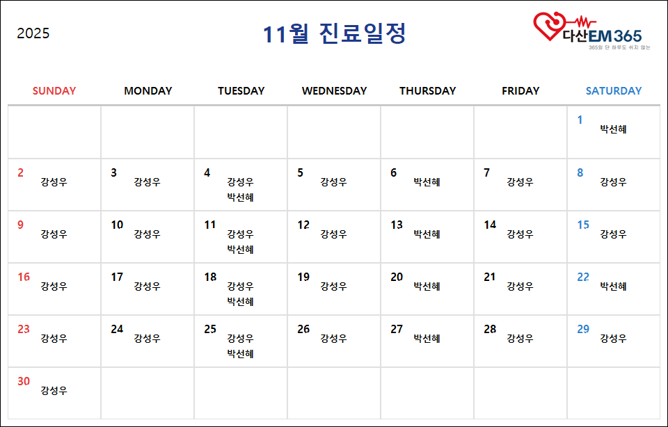 11월 진료 스케쥴 페이지 정보 작성자최고관리자 댓글댓글 0건 조회조회 160회 작성일 25-10-28 09:50 본문 목록 이전글 12월 진료 스케쥴 25.12.01 다음글10월 진료 스케쥴 25.09.26 댓글목록 댓글목록 등록된 댓글이 없습니다.